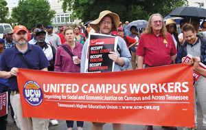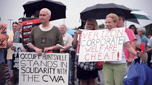 Hundreds of CWA members, activists and allies descended on Verizon's annual shareholders meeting in Huntsville, Ala., to make that message crystal clear. Protesters from the 99 Percent Spring coalition came from as far away as New Orleans and New York City. College students from the University of Central Florida, part of the Student Labor Action Project, made the 11-hour bus trip from Orlando to join the rally, and UCW-CWA members from the University of Tennessee made the trek from Nashville. Jobs with Justice, the AFL-CIO and the Greater Birmingham Ministries also lent their support, helping post VeriGreedy signs all along Interstate 565.