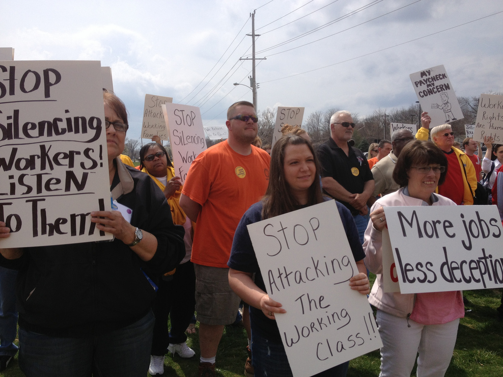 On Monday, about 200 union members – including CWA, UFCW and many more – rallied along Frontier Park in St. Charles to pressure the Republican-dominated state legislature to vote down paycheck deception, anti-prevailing wage and "right-to-work" for less bills. And over the weekend, workers went door-to-door to educate their friends, family and neighbors about the anti-worker legislation.
