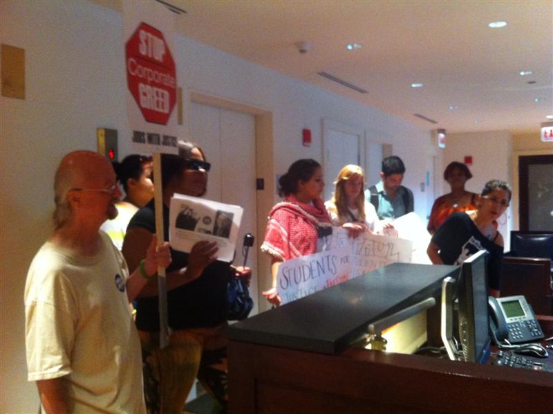 The delegation included CWA members, Jobs with Justice activists, and students. Their letter was backed by students from six midwestern campuses.