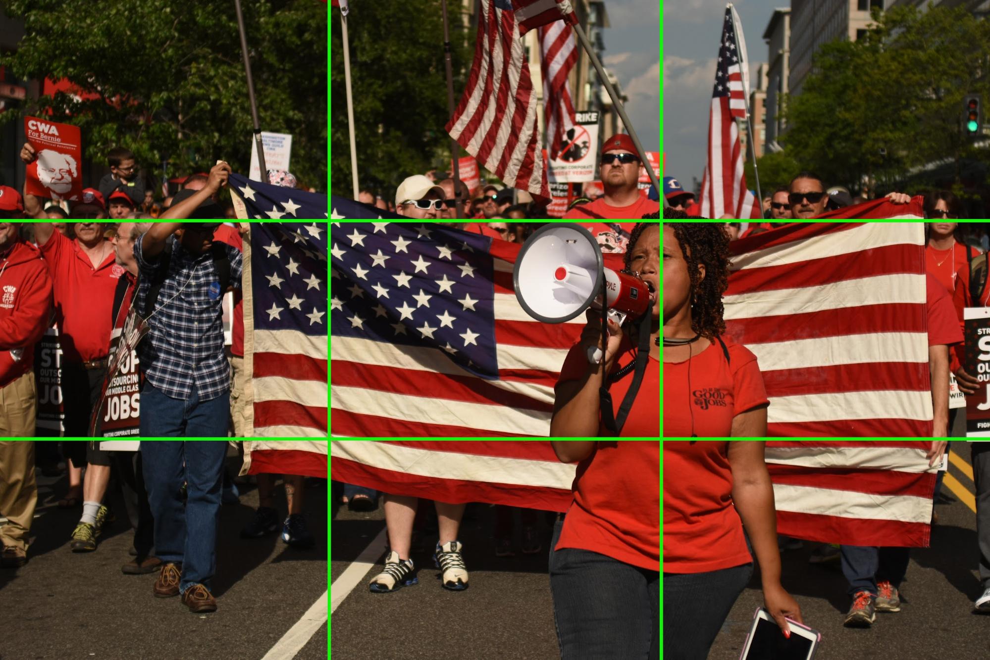 Look at this picture from the 2016 Verizon strike. The viewer’s gaze naturally focuses on the woman with the bullhorn, and the picture conveys a sense of movement and purpose.
