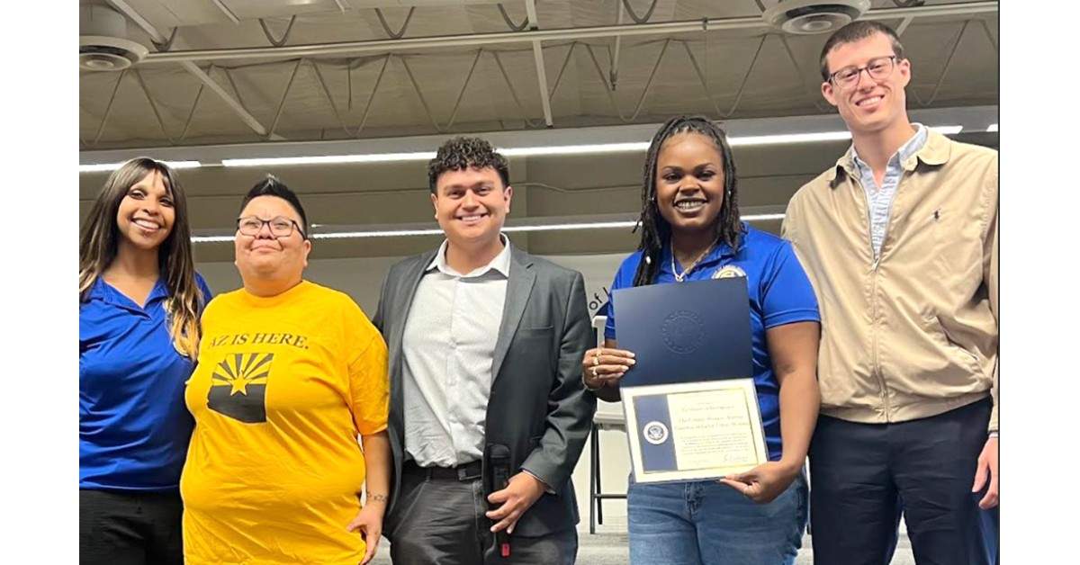 CWAers accepted a Certificate of Recognition from the office of Sen. Gallego (D-Ariz.) on behalf of the Arizona CLUW Chapter. Pictured left to right: Ariz. CLUW Vice President Vonda Wilkins (Vice President of CWA Local 7019), Ariz. CLUW Delegate Desi Navarro (a Vice President of PHEW-CWA Local 7000), Aid to Senator Gallego Jordan-Isaiah Toyos, Ariz. CLUW President Tayqwoiseceyon Akins (President of CWA Local 7050) and Aid to Senator Gallego Humberto Ibarra took part in the award ceremony.