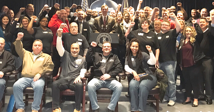 CWA and IUE-CWA members from CWA Locals 3301, 3310, 3312, and 3321 and IUE-CWA Locals 83643, 83701, 83761, and 83766 held a joint lobby day with the Kentucky AFL-CIO to urge their state elected officials to support pro-worker legislation including House Bill 13 to protect call center jobs.