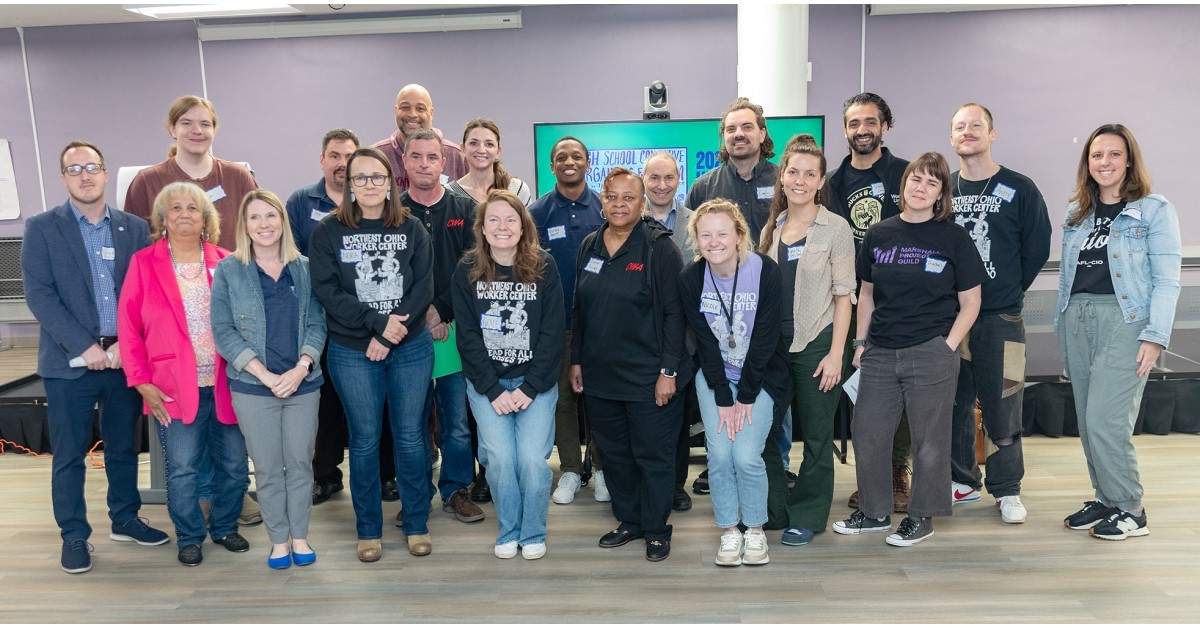 Staffers from CWA District 4, including CWA Staff Representative Ron Gay, Jr. (left, in CWA shirt). CWA District 4 Campaign Lead Renee Rouser (right and behind Gay), and CWA District 4 Staff Representative Diane Bailey (center), joined other union members and supporters to help educate high school students in Ohio on union membership and negotiation strategies.
