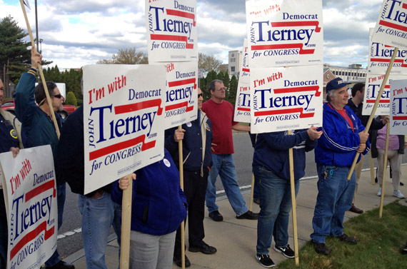 More than 50 IUE-CWA Local 201 members punched out or came in early at shift change to support Massachusetts Rep. John Tierney outside their plant.