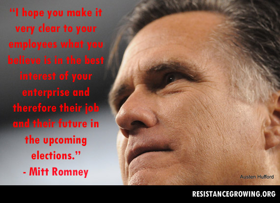 The troubling news is that Romney’s tactics aren’t new. Gawker recently reported that Westgate Resorts’ founder David Siegal emailed his employees to insinuate that they would be fired if Obama is reelected. And In These Times also broke the story that the Koch Brothers are attempting to influence their workers’ votes.