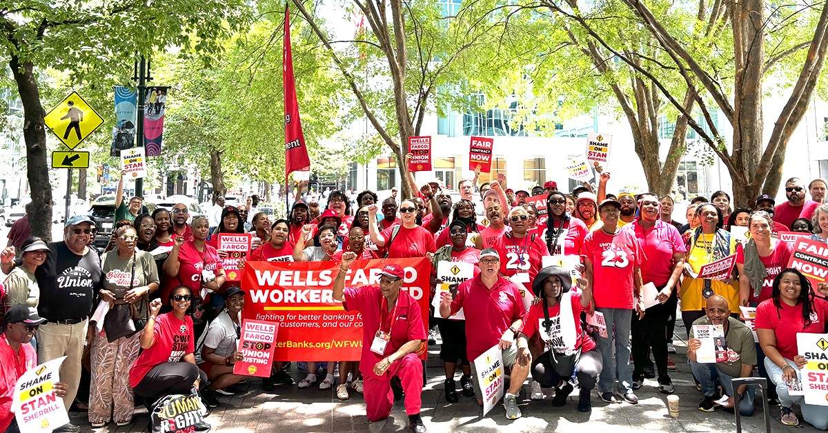 On Tuesday, July 15, CWA members and retirees joined the AFL-CIO, UNITE-HERE, United Auto Workers, Charlotte-Metrolina Central Labor Council, and other local organizations to rally outside Two Wells Fargo Center in Charlotte, North Carolina. Activists publicly condemned Wells Fargo for their illegal union-busting tactics and demanded that the company agree to a fair contract with Wells Fargo Workers United-CWA (WFWU-CWA) members.