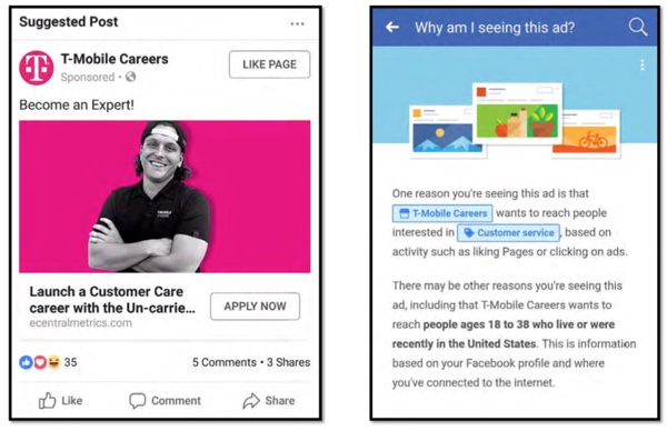 The Complaint alleges that T-Mobile US, a lead defendant, used Facebook ads to recruit applicants for retail stores and other positions nationwide, stating in its employment ads that T-Mobile “wants to reach people ages 18 to 38.” The other lead defendants sent similar ads. Amazon sent employment ads to reach people ages “ages 22 to 40” and “ages 18 to 50,” and Cox sent employment ads to reach people “ages 20 to 45” and “ages 20 to 50.”