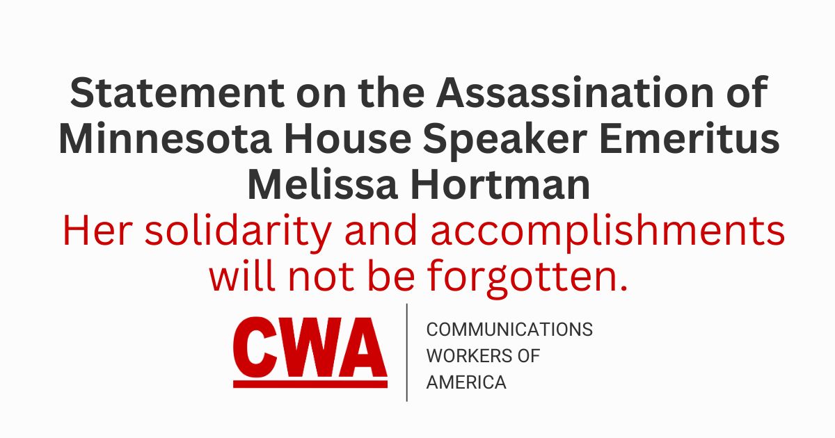 Our members in Minnesota and across our union are mourning the assassination of Minnesota House Speaker Emeritus Melissa Hortman and her husband Mark. We are also hoping for the full recovery of Minnesota Senator John Hoffman and his wife who were seriously wounded by the assassin.
